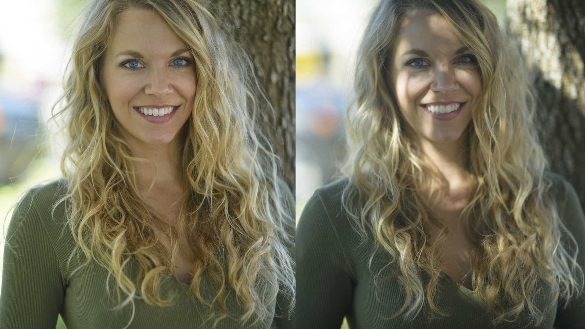Although I moved the subject under a tree, dapples of light shined through and cause unflattering shadows on the subject’s face. Adjust the subject the best you can to remove as many unwanted shadows as you can, then soften and balance the light with a diffuser. This will convert the quantity of light to a better quality of light.
